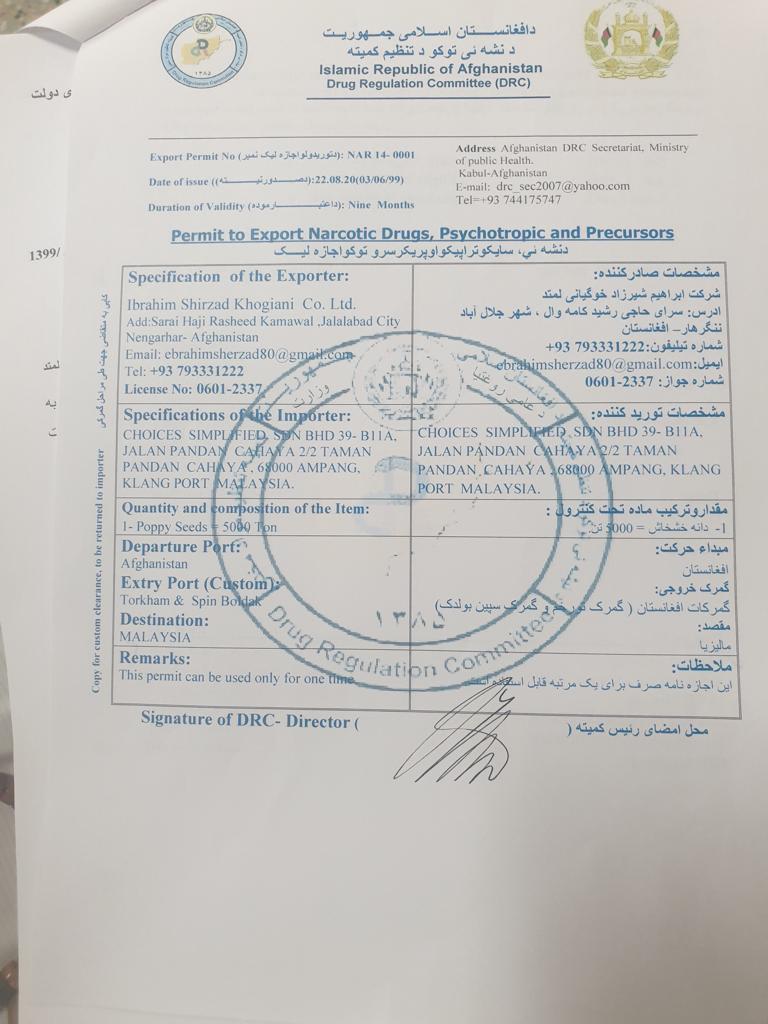 United Sherzad Commodities Group uses registered Afghan exporters operating under Drug Regulation Committee permits from the Ministry of Public Health. Below is our scan of NAR 14-0001, issued to Ibrahim Shirzad Khogiani Co. Ltd., Jalalabad. For new consignments, contact export for current permits.
